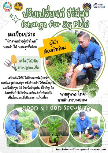 อำเภอบางปะกง ขอเชิญชวนทุกท่านน้อมนำแนวพระราชดำริของสมเด็จพระกนิษฐาธิราชเจ้า กรมสมเด็จพระเทพรัตนราชสุดาฯ สยามบรมราชกุมารี สู่ปฏิบัติการปลูกผักสวนครัว เพื่อสร้างความมั่นคงทางอาหาร ตามแนวทางประจำปีงบประมาณ พ.ศ. 2569 ภายใต้แนวคิด "ปรับเปลี่ยนดี ชีวีมีสุข" (Change for 5G Plus)
